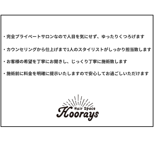 Hooraysでは、お客様一人ひとりに満足して頂く為にカウンセリングから仕上げまでを1人のスタイリストが、じっくり丁寧に担当させて頂きます。